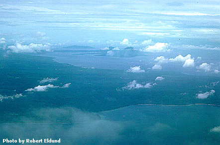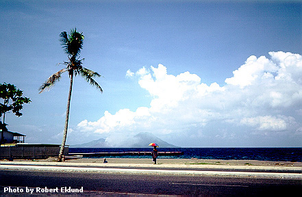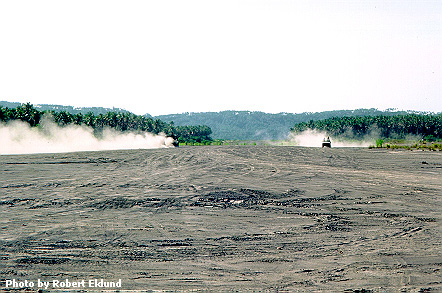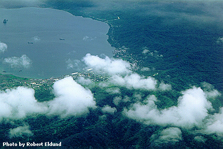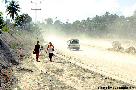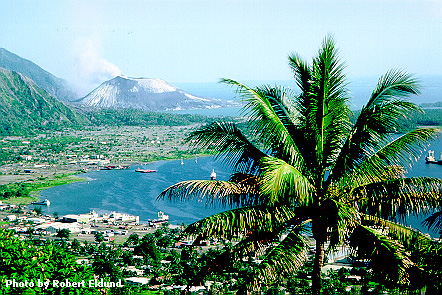 | Rabaul from the air | Rabaul from the arriving ship, Rabaul Queen, early in the morning | The view from the Volcanological Institute overlooking Rabaul | The old airport, since 1994 covered in a three meter thick ash layer | Rabaul airport, where the aircraft took off over Tuvurvur volcano, which is still smoking since the 1994 eruption |