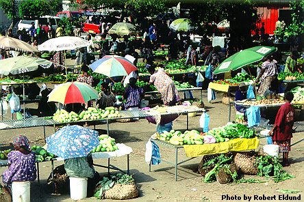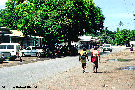 | Kokopo from the air. To the right Tokua Airport. On the other side of the bay you can see the volcanos surrounding Rabaul | A typical dusty street in Kokopo. The 1994 volcanic eruption covered the entire bay area with volcanic ash | Downtown Kokopo. Trying to replace the very dynamic Rabaul | The Kokopo market. Still not living up to the old Rabaul market | Waiting for a coach in Vunapope, a shopping center halfway out to the Tokua (New Rabaul) Airport |