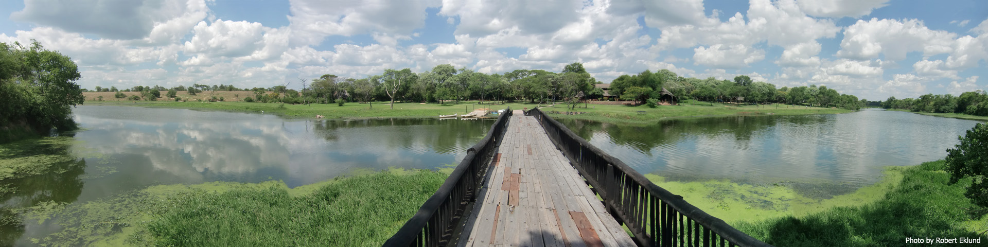 View from Island Lodge bridge towards main area, with reception and restaurant. |