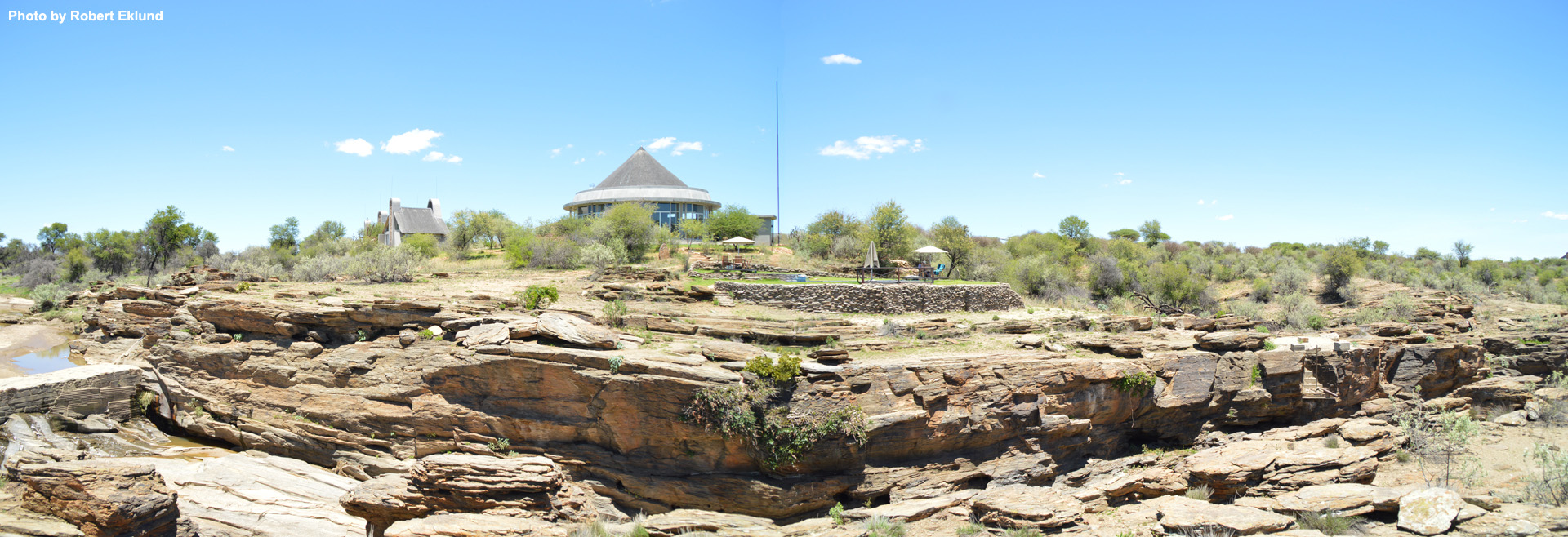 The N/a’an ku sê Lodge, with the swimming pool and canyon to the right, and the lodges dead center. |
